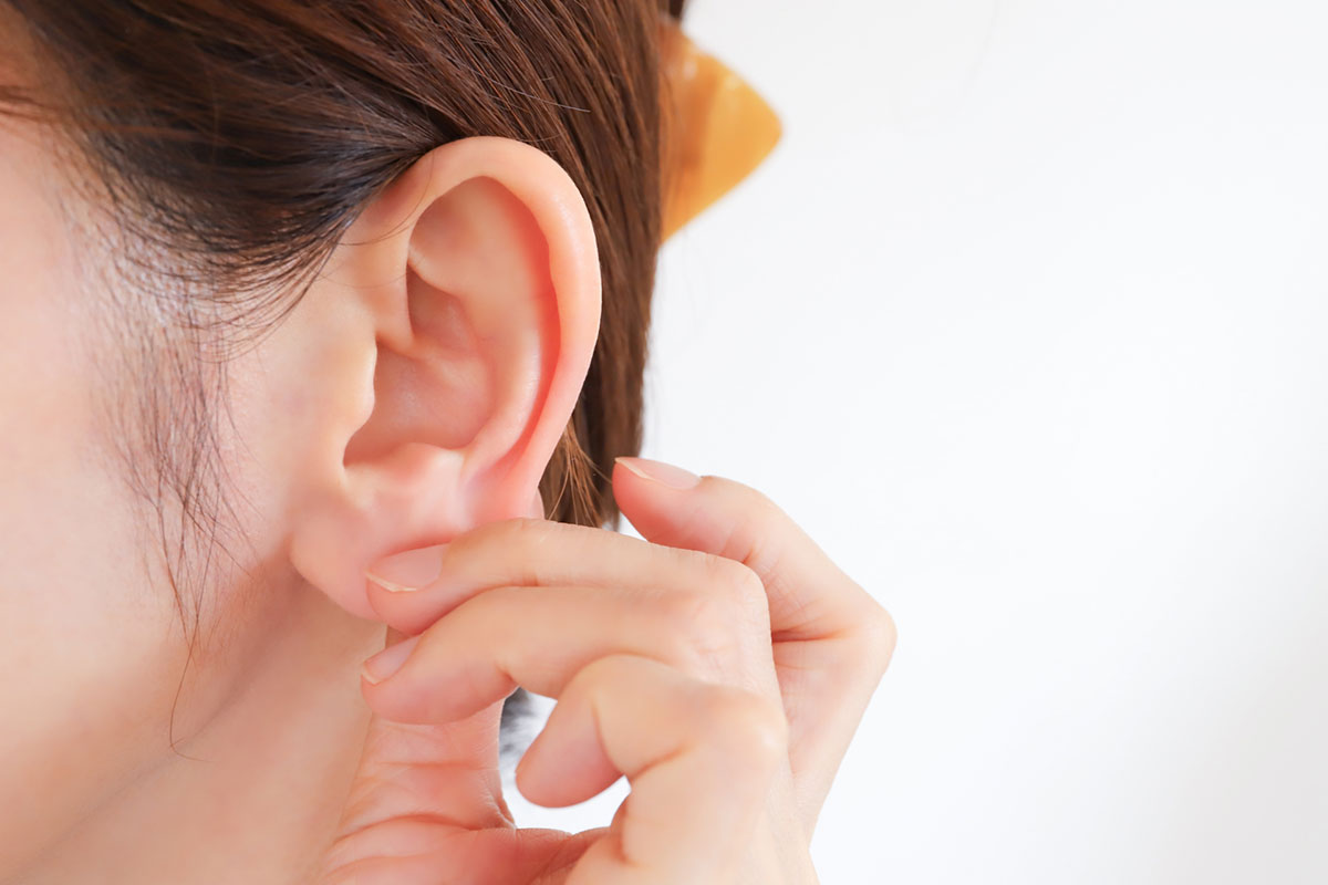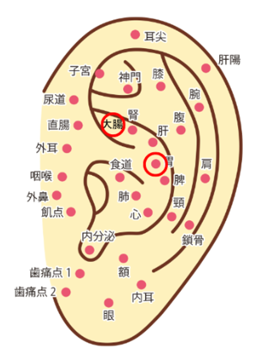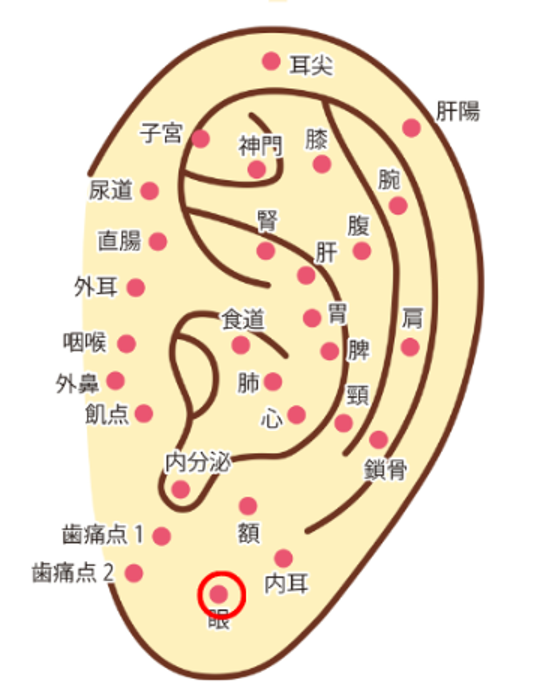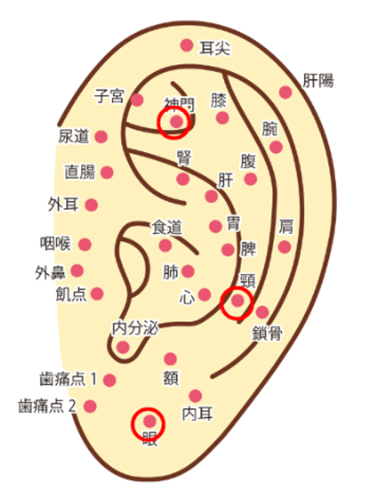 不調がある部分は痛みを感じる。跡が付くため耳つぼジュエリーを貼る目印になる。