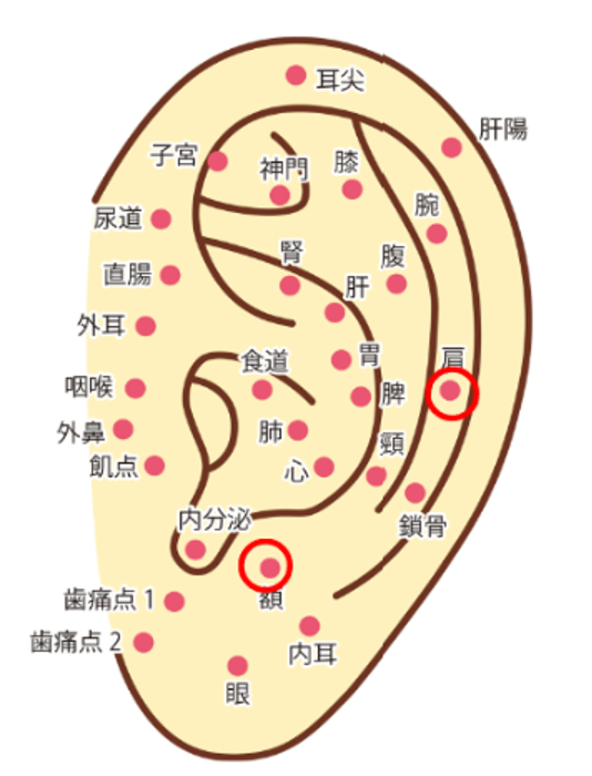 「スマートフォンやパソコンの使用で肩がこっている」「片頭痛がひどい」などとお悩みの方は、「額」と「肩」の ツボに耳つぼジュエリーを付けてみてください。