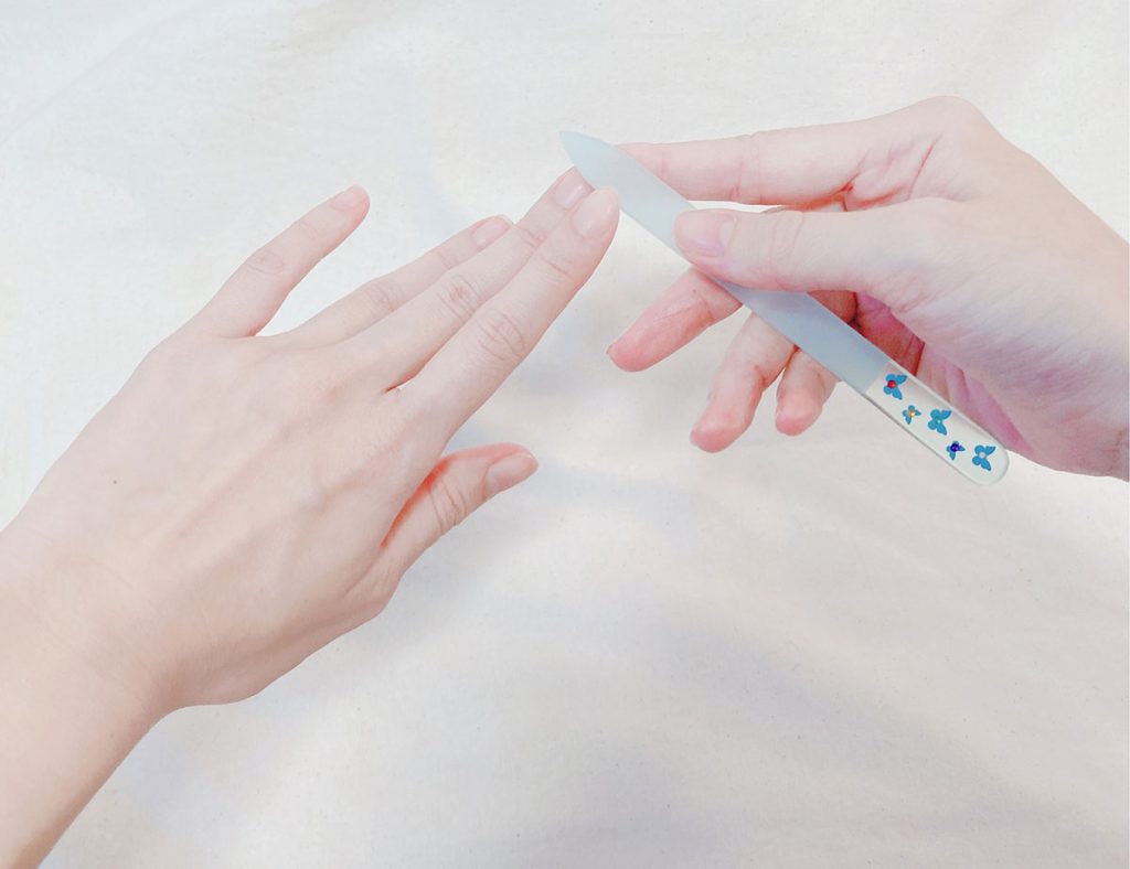 初めにネイルファイル(爪専用やすり)で、自爪の長さと形を整えます。親指・人差し指・中指の3本で、力を入れずに持ちましょう。