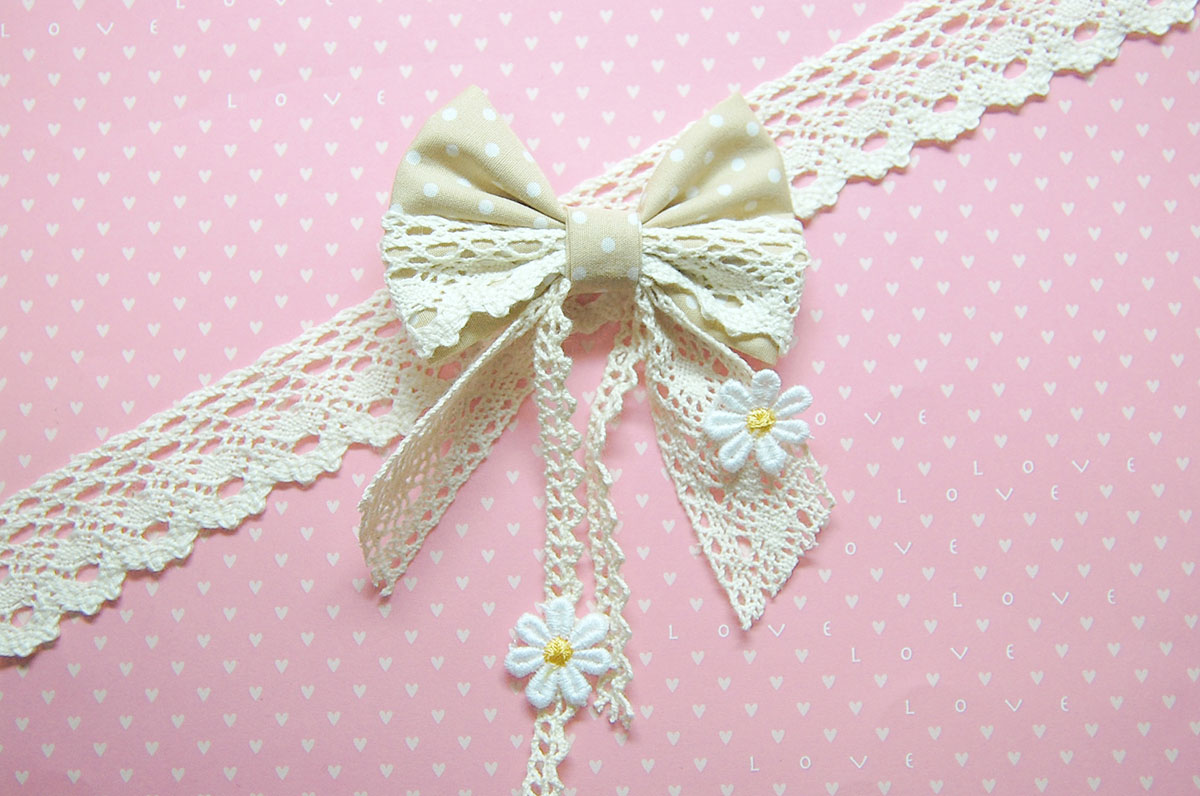 - レースを細長く切り、中央をぎゅっと結んでリボンの形にする(綿を入れた穴を隠す)