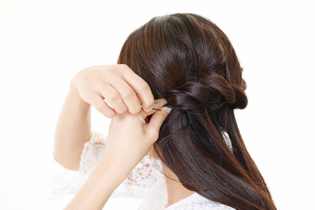 - サイドの毛束を三つ編みにして、ポニーの根元に巻きつける