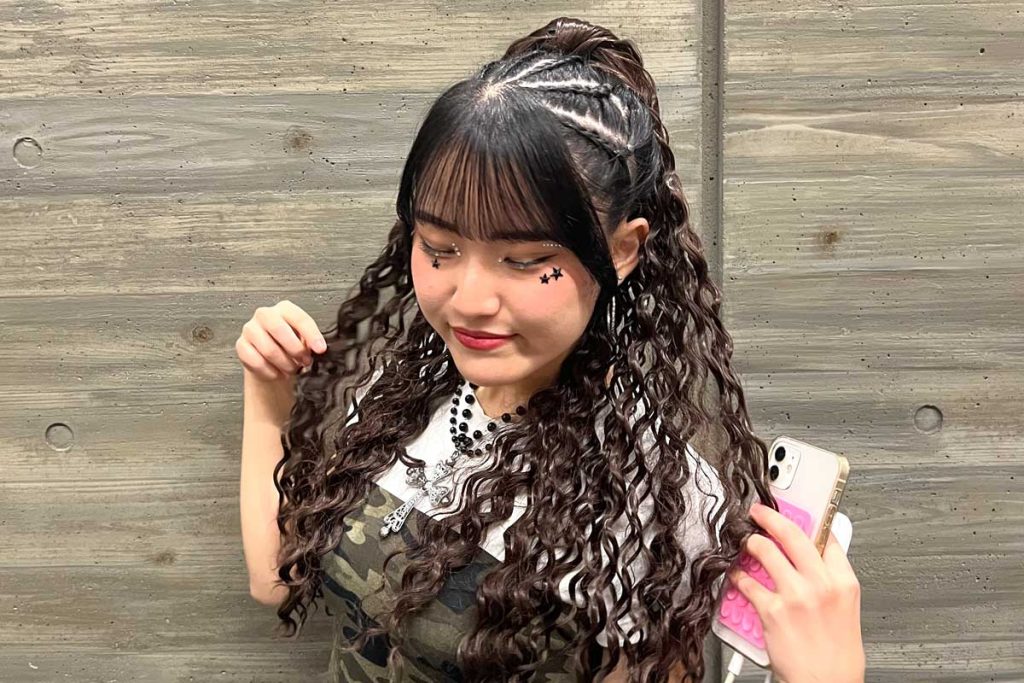 動くたびに揺れるカールが存在感抜群で、ダンスチームや文化祭のパフォーマンスにもぴったり!サイドをすっきりまとめることで、表情も明るく見せてくれるのがポイントです。