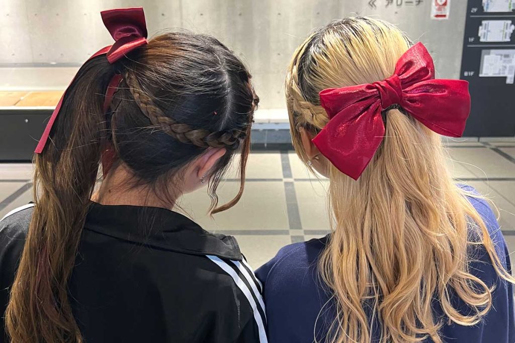 動いても崩れにくいので、体育祭や文化祭のダンス・応援にもおすすめ。赤リボンやチームカラーのリボンに変えるだけで、簡単にオリジナル感も出せます。