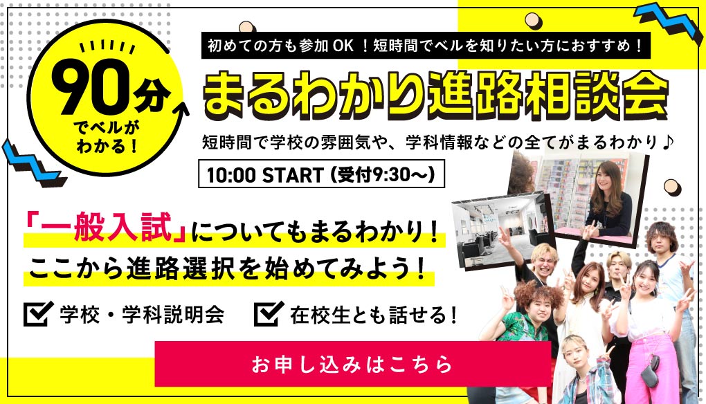 9:30 受付スタート/10:00 学校説明会/10:25 プチ美容体験/10:50 学科説明/11:10 個別相談/11:30 終了予定